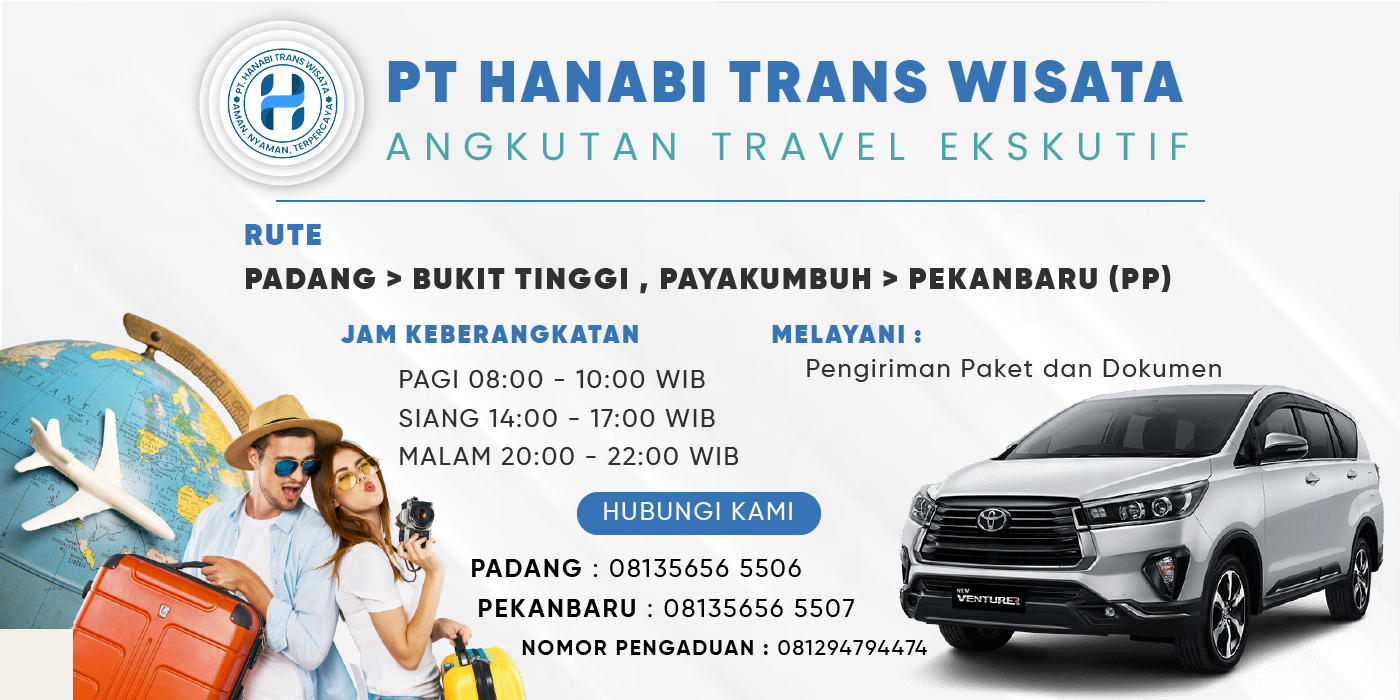 PT. Hanabi Trans Wisata adalah perusahaan transportasi yang menyediakan layanan travel eksekutif rute Padang – Bukittinggi – Payakumbuh – Pekanbaru. Kami mengutamakan kenyamanan, keamanan, dan ketepatan waktu perjalanan dengan armada terbaik serta layanan profesional untuk pelanggan di Sumatera Barat dan Riau.